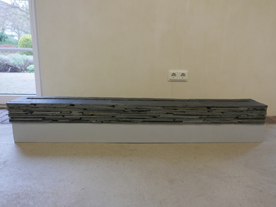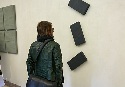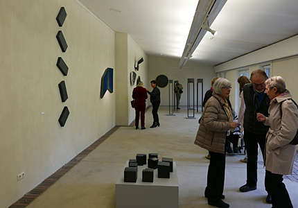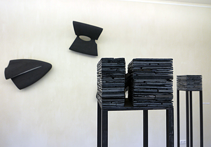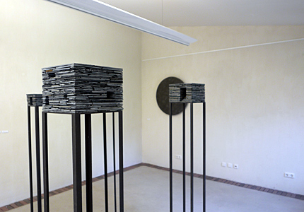 Gabriele Schulz - SchichtungenObjekte und WandarbeitenAusstellung vom 10. April bis 1. Mai 2016 Schichtungen, geologisch vorgegeben oder selbst erarbeitet, sind Themen im Werk der Künstlerin Gabriele Schulz aus dem Sauerland. Sie nutzt natürliche Materialien wie Reisig oder Schiefer sowie den Werkstoff Zellulose, den sie im Trocknungsprozess zur Form verdichtet und der seine sinnliche Präsenz aus der plastischen Qualität bezieht. Hinter der scheinbaren Einfachheit der Papierobjekte verbirgt sich ein komplexer Arbeitsprozess. Ihre Objekte sind massiv aufgebaut durch eine Schichtung der Zellulose, die sie aus Tageszeitungen gewinnt. ![]() Häuser, Schiefer/Stahl, 2014 © Gabriele Schulz Im Material Schiefer, das die Künstlerin für unterschiedliche Werkgruppen nutzt, ist die Schichtung erdgeschichtlich angelegt. Aus heimisch abgebautem Schiefer gestaltet Gabriele Schulz klar definierte Stelen, Hausformen und Wandarbeiten, die den Charakter des Tongesteins und seine besondere Struktur aufnehmen: geschichtete Zeit, die in den archaisch anmutenden Häusern oder den schlanken Stelen geheimnisvoll im Inneren geborgen scheint. Die Ausstellung findet im Rahmen des Projekts KUNSTACHSE NRW in Kooperation mit dem Hagenring e.V. statt. Es erscheint ein Katalog zum Preis von 8 Euro. Einführungsrede von Dr. Andrea BrockmannSchichtung lautet der passende und auf den Punkt gebrachte Titel der Ausstellung der Künstlerin Gabriele Schulz hier im Brühler Kunstverein sowie des begleitenden Katalogs der Kunstachse NRW. in ihren Werken bezieht sich der Begriff Schichtung zum ersten auf das Material. Gabriele Schulz arbeitet gerne und häufig mit Schiefer. Das blau-graue, seidig glänzende Gestein hat besondere Eigenschaften, eine lange erdgeschichtliche Entwicklung und sehr viel mit der Heimat der Künstlerin, dem Sauerland, zu tun.Bei genauerer Betrachtung von Schiefer fällt auf, dass das Gestein aus vielen aufeinanderliegenden Platten und blättchenartigen Strukturen besteht, deren mineralische Anordnung entweder ein linienhaftes Gefüge oder die Abfolge von Schieferungsflächen anzeigt. Vor rund 350 Millionen Jahren entstand durch unterschiedliche geologische Zufälle aus feinkörnigem Tonschlamm das Sedimentgestein Schiefer. Zunächst lagerte sich Tonschlamm im Meer ab. Das Material ist Verwitterungsschutt, der durch Wind und Flüsse vom Festland zum Meer transportiert und dort parallel in feinen Schichten abgelagert wurde. Mit zunehmendem Druck wurde der abgelagerte Tonschlamm immer mehr verdichtet, das enthaltene Wasser herausgepresst, der Schlamm in einen Tonstein und schließlich in Tonschiefer umgewandelt. Schiefer, der sich durch eine ausgeprägte Spaltbarkeit auszeichnet, wird heute in Deutschland noch in der Eifel, im Hunsrück, in Thüringen und im Sauerland abgebaut wird. Gabriele Schulz lebt im Sauerland, in Schmallenberg. Sie fährt 5 Kilometer zur Schiefergrube. Manchmal findet sie auf der hohen Abraumhalde passende Platten, Reste, Bruchstücke oder sie lässt sich gekauftes Material aus dem harten Qualitätsgestein zuschneiden. Die Fundstücke verarbeitet sie in Stelen, wie vor dem Eingang, und zu archaischen Häusern. Schwere Platten gestaltet sie als leichtes, fliegendes Wandobjekt oder sie arbeitet mit zugeschnittenen, von ihr fein geschliffenen Schieferkuben wie in ihrer neuesten Arbeit „Siedlung“. Der Begriff Schichtung verweist zum zweiten auch auf die Arbeitstechnik. Sie schichtet nicht nur Schiefer, sondern auch Papier als Zellulose. Hinter der scheinbaren Einfachheit der Papierobjekte (Mond, Mondvögel, Im Schilf) verbirgt sich ein komplexer Arbeitsprozess. Die Objekte sind massiv aufgebaut, d.h. durch eine Schichtung von Zellulosemasse, deren Grundstoff aus Tageszeitungen gewonnen ist, genauer: ausschließlich aus dem Papier der FAZ. Der Zellstoffbrei wird wiederholt aufgetragen, dabei mit Farbpigment versetzt, und dann getrocknet. Ein mitunter langwieriger Vorgang, der Konzentration, Übung, Geduld verlangt. Aus mehreren Lagen Zellulose gebildet, sind ihre Arbeiten räumliche Objekte, in denen sich die Farbe über mehrere Schichten hinweg entwickelt und dadurch eine besondere Präsnz und Sinnlichkeit erhält. Und all‘ die Schichten aus Zeitungpapier beinhalten, konservieren, verwahren mithin auch die dort abgedruckten Ereignisse, Meldungen, Nachrichten, die Welt in einem flüchtigen Moment bewegt haben. Sie überdauern nun in den Objekten, machen sie „gehaltvoll“. Und das weist auf die dritte Schichtung: die Bedeutungen, Intentionen, Aussagen, Bewusstseinsschichten ihrer Werke. Geschichte, kollektives Gedächtnis, Urgefühle, auch aktuelles Weltgeschehen sind Themen, die Gabriele Schulz beschäftigen. So hat sie 2014/2015 eine Installation aus Dutzenden von Schuhen, geformt aus Zellulose, geschaffen, die sehr eindrücklich und eindringlich die Situation der Millionen von geflüchteten Menschen auf der Welt – in der Vergangenheit und heute – visualisiert. Diese Installation hat sie u.a. in der Galerie des Hagenringes gezeigt. Auch die hier ausgestellten Häuser sind Sinnbild. Sie wirken auf ihren hohen filigranen Füßen wie über den Wogen des Meeres thronend und werden zur Metapher: Das Haus als menschliche Behausung, auch wenn die menschliche Figur völlig fehlt. Das Haus als Zeichen, als humanistisches Symbol, als Geborgenheit bietender Kubus. Diese Hausskulpturen wirken archaisch, wie aus der Zeit gefallen bzw. die Häuser sind Zeitspeicher, die die Geschichte, das kollektive Gedächtnis, die Erinnerung an die Ahnen sowie die Existenz im Diesseits über die Zeit in sich aufbewahren. Es sind Orte eines Lebens, die außen sehr verschlossen wirken, jedoch im Inneren erahnen wir Strukturen, Gänge, Treppen, Wege, die wir in unserem Leben gehen. Die Häuser besitzen eine gewisse schlichte Monumentalität, die sie zu Erinnerungszeichen macht, und nicht zuletzt eine Würde, die aus der einfachen, archaischen Formensprache herrührt. In der Kombination mehrerer di