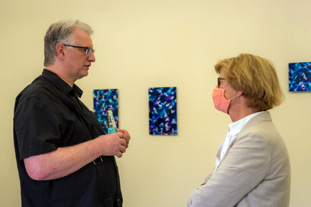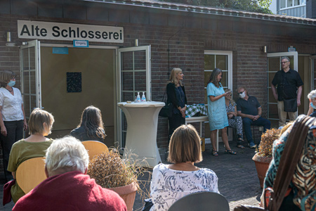 Bilder von der Eröffnung![]() Die Eröffnung fand bei schönem Wetter auf der Terrasse der Alten Schlosserei statt. ![]() Die Vorsitzenden des BKV C.Meck-Theben und G.Zimmermann, Rita Rohlfing und der Kunsthistoriker Dr. Peter Lodermeyer (v.l.n.r.) ![]() Dr. Peter Lodermeyer im Gespräch mit einer Besucherin ![]() ![]() ![]() Besucher der Ausstellung ![]() Blick in den Ausstellungsraum, im Vordergrund die Arbeit "Die Welle" von 2008 Fotos: D. Schöddert |