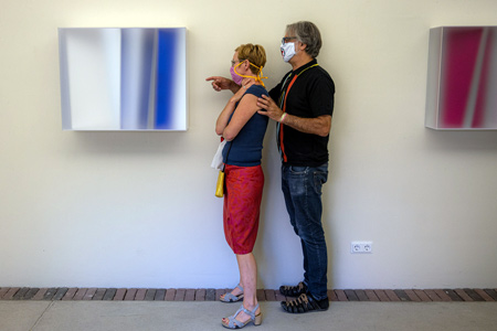 Rita Rohlfing - new worksAusstellung vom 13. September bis 4. Oktober 2020Es ist eine Spezialität der Kölner Künstlerin Rita Rohlfing, die Wahrnehmung der Betrachter ihrer Werke tiefgreifend zu irritieren. Ihre Acrylglasobjekte, die sogenannten „Spaces“, erzielen diese Wirkung, indem sie dem Auge bewusst Information vorenthalten. In ihrem Inneren registriert man Farbphänomene, die sich mit jedem Schritt, bei jedem Standortwechsel unvorhersagbar verändern, doch bleibt die Ursache dafür verborgen und somit unerklärlich. Neben ihren „Spaces“ wird Rita Rohlfing im Brühler Kunstverein ganz neue, farbstarke und überraschend expressive Arbeiten mit Öl auf Aluminium zeigen. Diese Bilder, die während des coronabedingten Lockdowns entstanden sind, überraschen mit großer Vitalität und enormer Farbintensität. Wer die Arbeit der Künstlerin kennt, wird mit ihr vor allem die Farbe Rot in allen erdenklichen Valeurs assoziieren und daher umso mehr von den kühlen Blau- und Violetttönen der neuen Arbeiten erstaunt sein. Mit der Kombination von „Spaces“ und neuen Gemälden verdeutlicht die Ausstellung sowohl die tiefe Verwurzelung Rita Rohlfings im Feld der Farbmalerei als auch die Tatsache, dass sie ihre Auffassung von Malerei immer auch konsequent in den realen Raum hinein erweitert hat. (Dr. Peter Lodermeyer) Weitere Informationen zur Künstlerin und ihrem Werk unter ritarohlfing.de ![]() Rita Rohlfing - untitled, 2020, Öl auf Aluminium, 34 x 77 x 3 cm | |