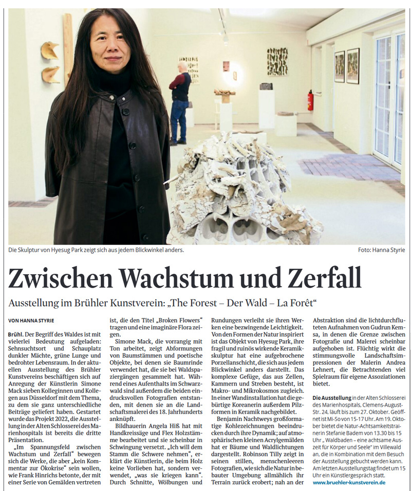 The Forest - Der Wald - La ForêtAusstellung vom 6. Oktober bis 27. Oktober 2024Teilnehmende Künstler: Frank Hinrichs, Angela Hiß, Gudrun Kemsa, Andrea Lehnert, Simone Mack, Benjamin Nachtwey, Hyesug Park, Robinson Tilly![]() The Forest - Der Wald - La Forêt - Grafik: BKV/D.Schöddert Zur AusstellungIn der letzten Ausstellung in diesem Jahr präsentiert der Brühler Kunstverein in der Alten Schlosserei eine Themenausstellung mit mehreren Künstlern: The Forest – Der Wald – La Forêt. Die Künstlerin Simone Mack ist die Initiatorin eines Projektes zum Thema "Natur/Wald", das 2022 startete. Sie hat dafür sieben Künstlerinnen und Künstler aus Düsseldorf angesprochen, deren Arbeiten ihr zu diesem Thema interessant erschienen. Diese Werke in verschiedenen Techniken wie Holzbildhauerei, Ton/Keramik, Malerei/Zeichnung, Fotografie und Video weisen eine vielseitige, qualitativ anspruchsvolle und miteinander spannungsreiche Bearbeitung des Themas "Wald" auf. Das Interesse der Besucher und ihr Zuspruch in bereits zwei realisierten Ausstellungen hat das Team darin bestärkt, das Projekt weiter zu entwickeln und dieses an weiteren Ausstellungsorten wie der Alten Schlosserei zu zeigen. In der Ausstellung wird das Phänomen "Wald" thematisiert, als Sinnbild und Chiffre eines bedrohten Ortes. Die Ausstellung sucht darüber hinaus durch Veranstaltungen und Diskussionen "am runden Tisch" die Interaktion zwischen Kunst und Publikum zu diesem sensiblen Thema zu inszenieren und zu fördern. Die Besucher können gespannt sein, wie die teilnehmenden Künstlerinnen und Künstler Frank Hinrichs, Angela Hiß, Gudrun Kemsa, Andrea Lehnert, Simone Mack, Benjamin Nachtwey, Hyesug Park sowie Robinson Tilly jeweils ihre Position im Ausstellungsraum präsentieren werden.![]() Artikel im Kölner Stadt-Anzeiger vom 8.10.2024 - Zum Lesen bitte Anklicken! Zusatzveranstaltung: Waldbaden – Achtsamkeit in der NaturDer Wald macht uns viele Angebote zum Suchen und Finden, er spricht viele Einladungen aus, loszulassen und aufzunehmen. Im Rahmen unserer Kunstausstellung haben Sie die Möglichkeit, bei einem neuen Wald-Erlebnis dabei zu sein. Die Natur-Achtsamkeitstrainerin Stefanie Badem führt Sie ein in das "Waldbaden - eine achtsame Auszeit für Körper und Seele".Die Veranstaltung ist in Kombination mit dem vorherigen Besuch der Ausstellung buchbar. Der Termin ist: Samstag, 19. Oktober 2024 von 13.30 bis 15 Uhr. Teilnehmergebühr für Mitglieder 10 Euro, Nichtmitglieder 13 Euro Anmeldung über BKV erforderlich unter 02232 - 925384 oder per E-Mail an info@bruehler-kunstverein.de Bei Sturm oder Dauerregen gibt es einen Ersatztermin. |
