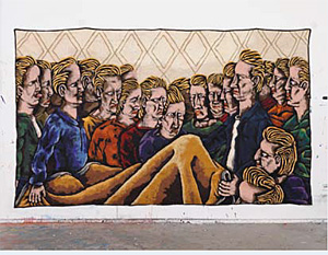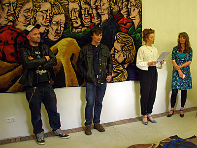 ![]() Sebastian Weggler: Selbstportrait als Teppichhändler, 2011, © Sebastian Weggler, Ben Hermanni ![]() Torsten Mühlbach: Fleischteppich II, 2009 © Torsten Mühlbach, Courtesy Galerie Filser & Gräf, München Bilder von der Eröffnung![]() In das Werk der beiden "Profis" führte Felicia von Karais (2.v.r.)ein. ![]() Zwei Noch-Amateure unterhielten das Publikum mit klassischer Gitarrenmusik: Erik (l.) und Noé. ![]() Die Profis: Torsten Mühlbach (l.) und Sebastian Weggler ![]() Zwei Besucher neben "Good Night and good Luck" von Torsten Mühlbach. ![]() Besucher schauen sich die Wandteppiche von Sebastian Weggler auf dem Podest an. |