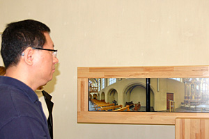 Sukyun Yang & Insook Ju - ErnstAusstellung vom 15. September bis 6. Oktober 2013Das aus Korea stammende und heute in Düsseldorf lebende Künstlerpaar Insook Ju und Sukyun Yang zeigt Panoramaaufnahmen von Brühler Innenräumen. Viele Einzelbilder werden in digitaler Montage zu einem Werk zusammengefasst. Durch diese Rundumschwenks um 360 Grad offenbaren sich die dem Betrachter eventuell schon bekannten Räume in einer überraschenden neuen und ungewohnten Ansicht. Neben Profanbauten der Brühler Historie haben die Künstler auch einige Kirchen fotografiert: "Eine Sicht auf Sakralräume, die Architektur vollständig wiedergibt und doch konsequent den Bedingungen der Wahrnehmung und des Kameraauges unterwirft. Ein gesteigertes, lebhaft bewegtes und expressiv kurvendes Raumerlebnis, bei dem kaum ein Stein auf dem anderen und die Kirche doch stehen bleibt!" Zitat: Prof. Dr. Manfred Schneckenburger Homepage der Künstler Sukyun Yang & Insook Ju Ein Video von der Vernissage gibt es bei Youtube. |
